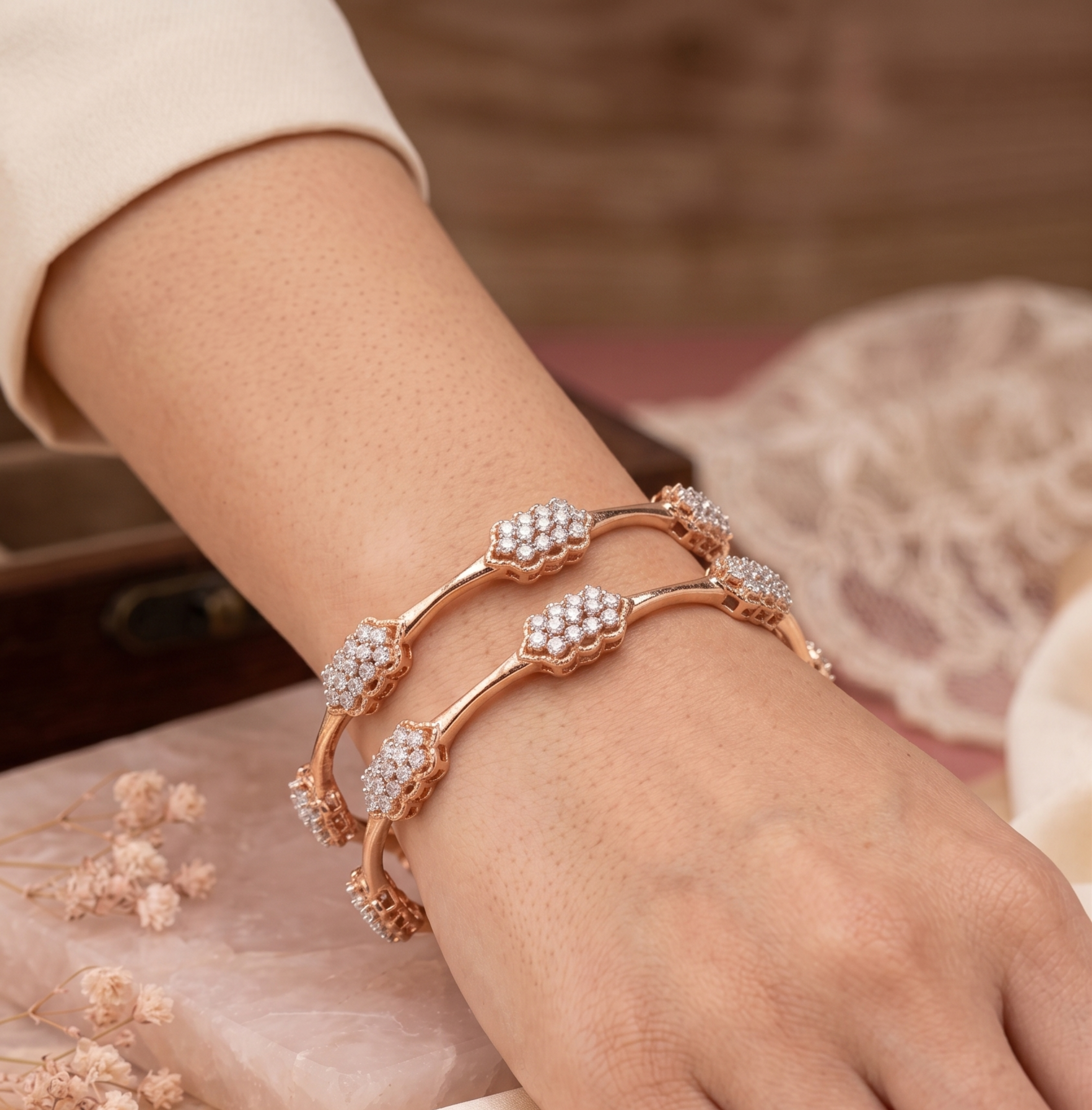 This exquisite rose gold bangle showcases a graceful sequence of diamond-studded blossom motifs, delicately connected through sleek polished links. Each cluster sparkles with finely set diamonds, creating a rhythmic flow of brilliance and charm. The airy, open-link structure enhances comfort while adding a touch of modern sophistication. A perfect blend of elegance and artistry, this bangle radiates subtle luxury.