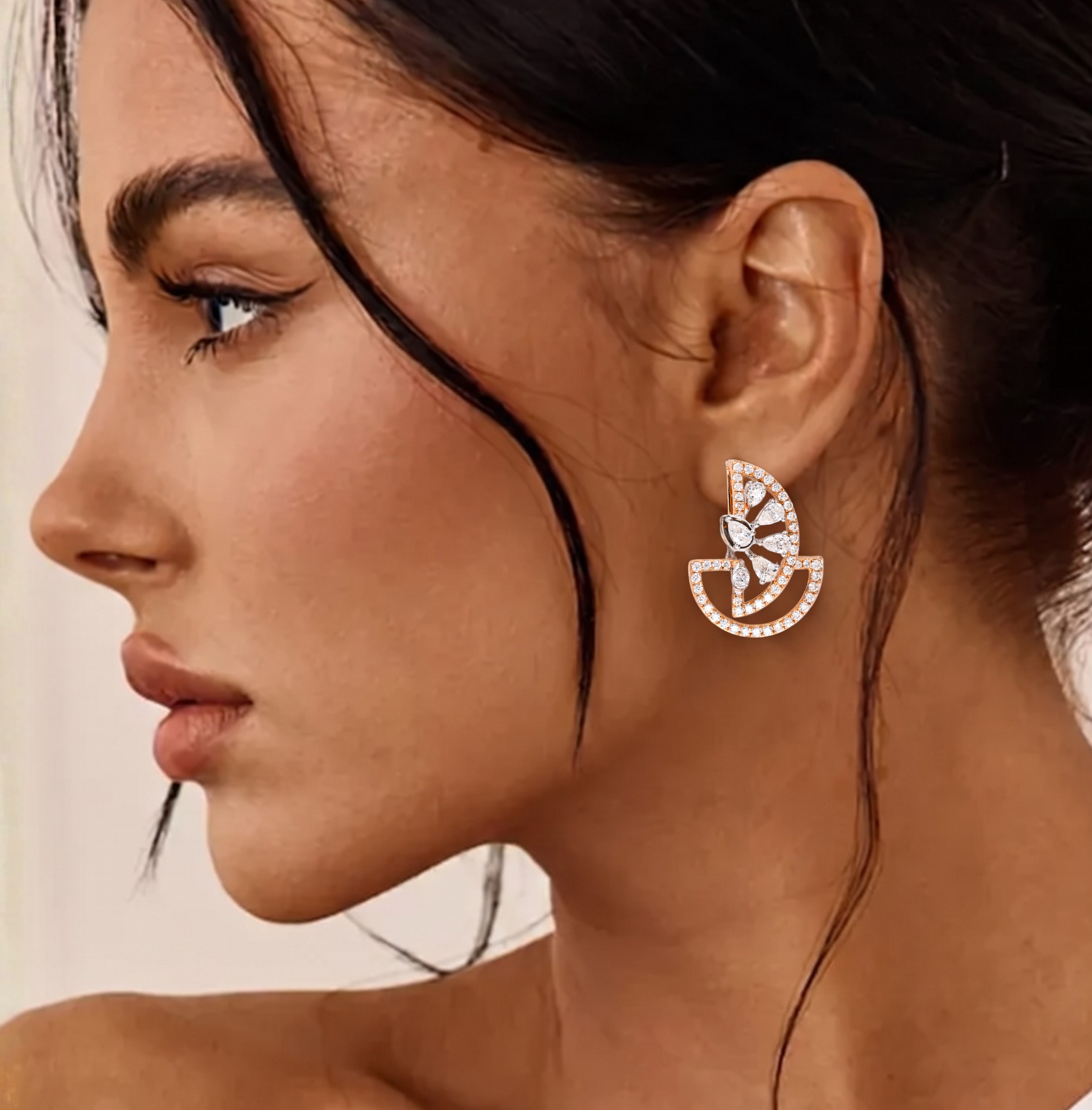 This architectural design is composed of two distinct, overlapping geometric sections. The upper portion features a vertical, semi-oval frame filled with a radial "fan" of pear-shaped diamonds that point toward a central focal stone. Below this sits a wider, horizontal semi-circular "cradle" that mirrors the pavé detailing of the top. The open-space design (negative space) between the gold frames makes the piece feel light and airy despite its substantial size.