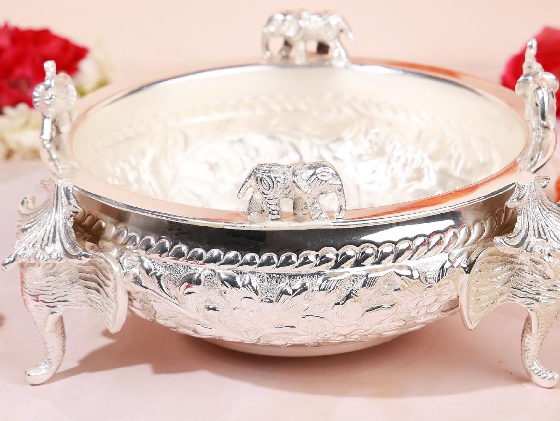 A stunning decor piece inspired by traditional urli design, featuring elegant elephant trunk detailing along with an integrated photo frame. This artistic creation adds a royal and cultural charm to your space while allowing you to display your cherished memories. Perfect for enhancing festive and home décor with a luxurious touch.