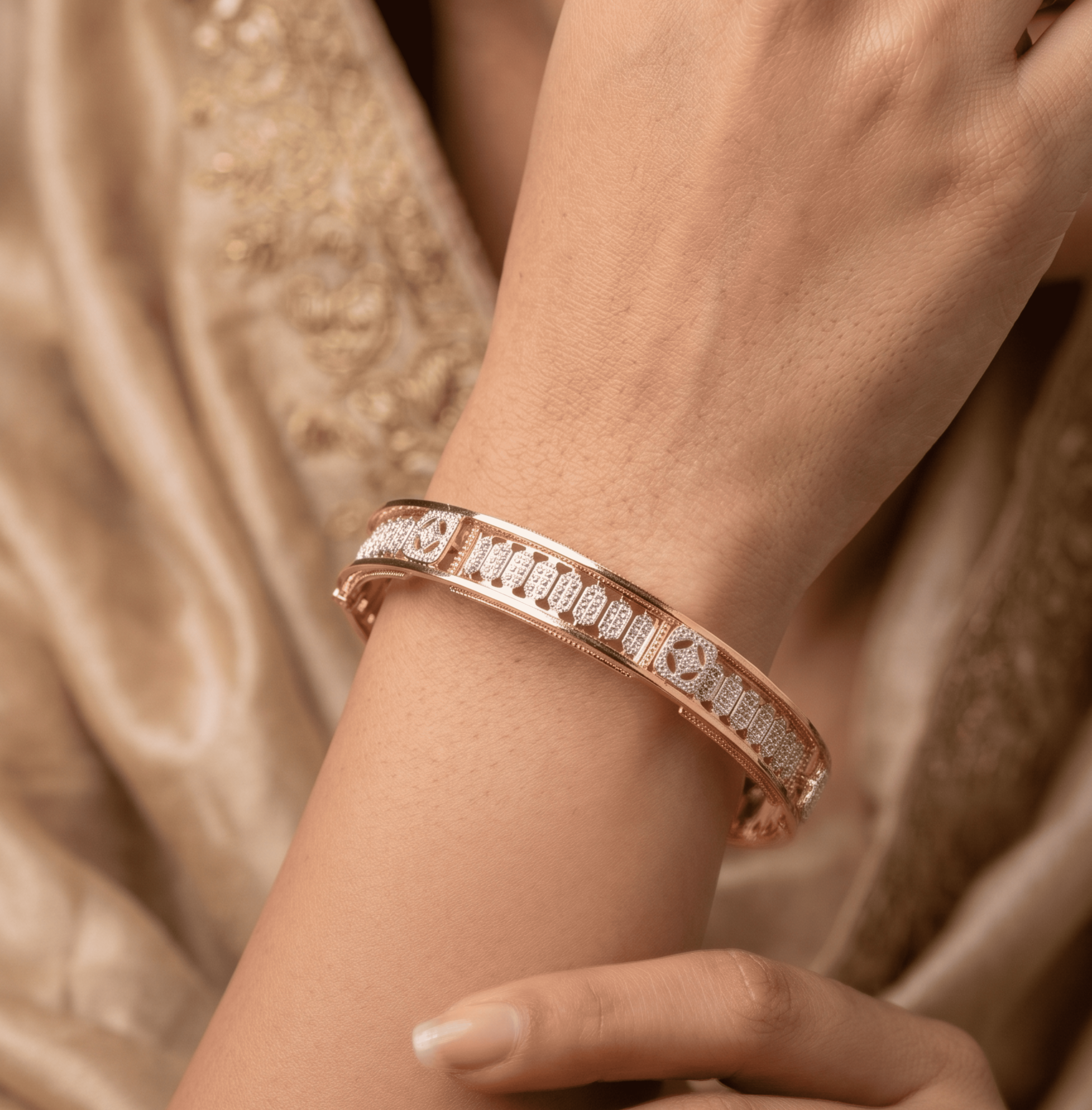 Crafted in radiant rose gold, this elegant bangle features a striking lattice-inspired design enhanced with finely set shimmering diamonds. The intricate pattern adds depth and brilliance, while the sleek structure ensures a comfortable yet luxurious fit. Perfectly balancing modern aesthetics with timeless charm, this bangle is designed to elevate both everyday elegance and special occasion looks.