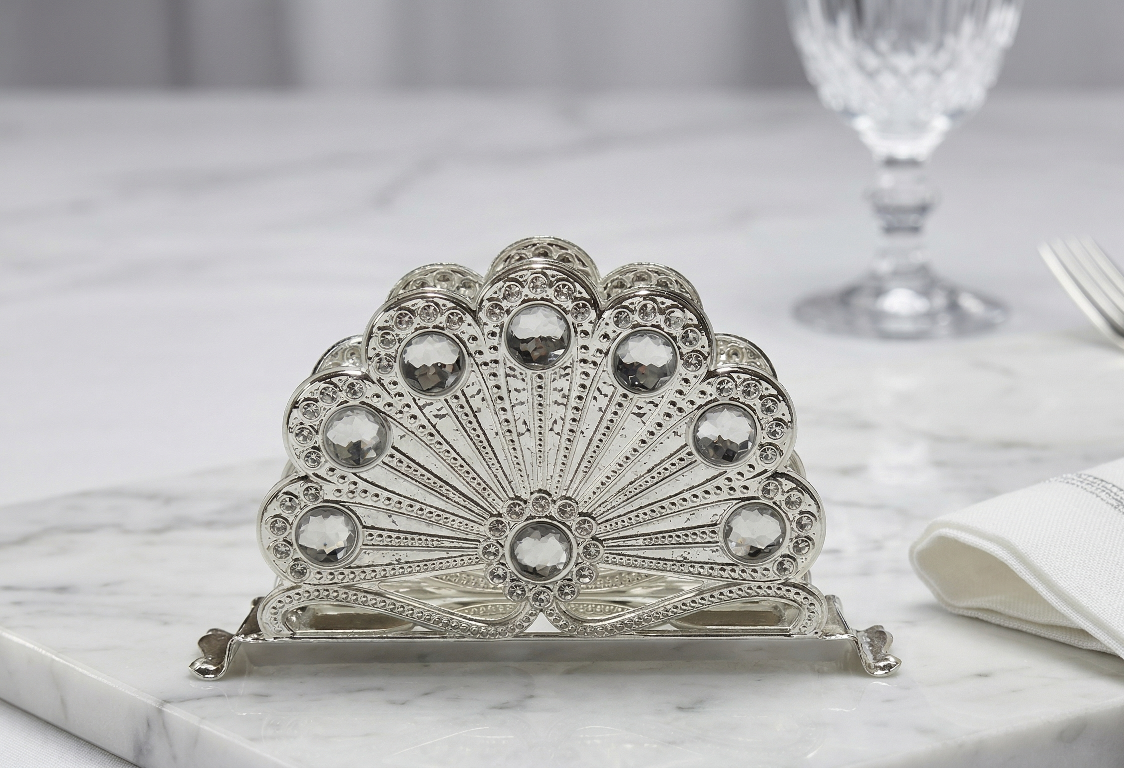 This silver napkin holder is a perfect blend of elegance and utility, crafted to enhance your dining experience. Featuring a detailed ornamental design with a premium polished finish, it adds a luxurious touch to any table setting. Its sturdy metal construction ensures durability, while the compact structure keeps napkins organized and easily accessible. Ideal for both everyday use and special occasions, it serves as a stylish décor piece as well as a functional accessory.