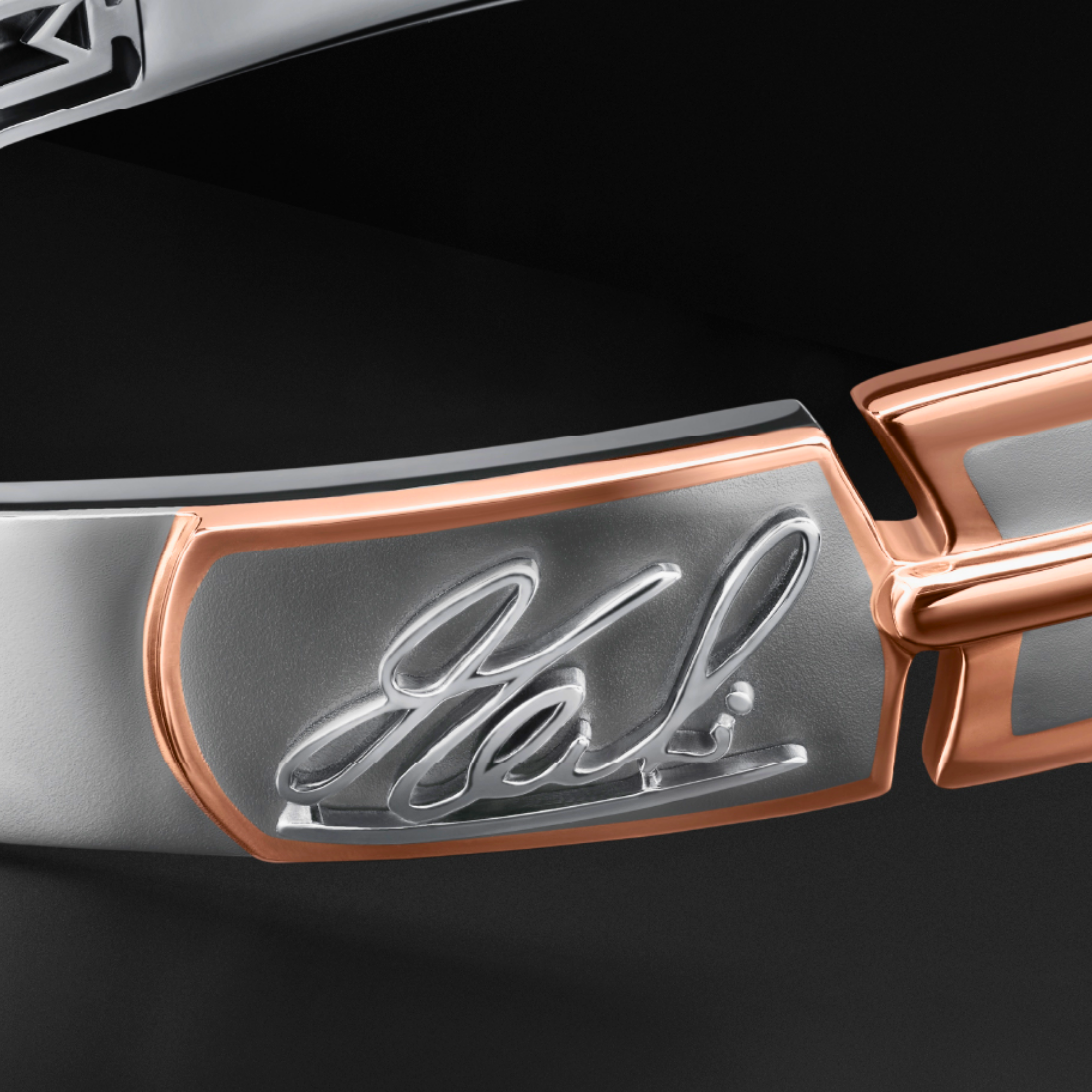 This meticulously crafted platinum bracelet with minimal rose gold detailing features a cricket bat silhouette with an embossed signature of MS Dhoni that embodies his legendary journey. Cast in platinum – an enduring precious metal that lasts a lifetime despite daily wear, making it rare – this piece is a testament to resilience & determination, inspiring you to embrace the greatness that lies within.