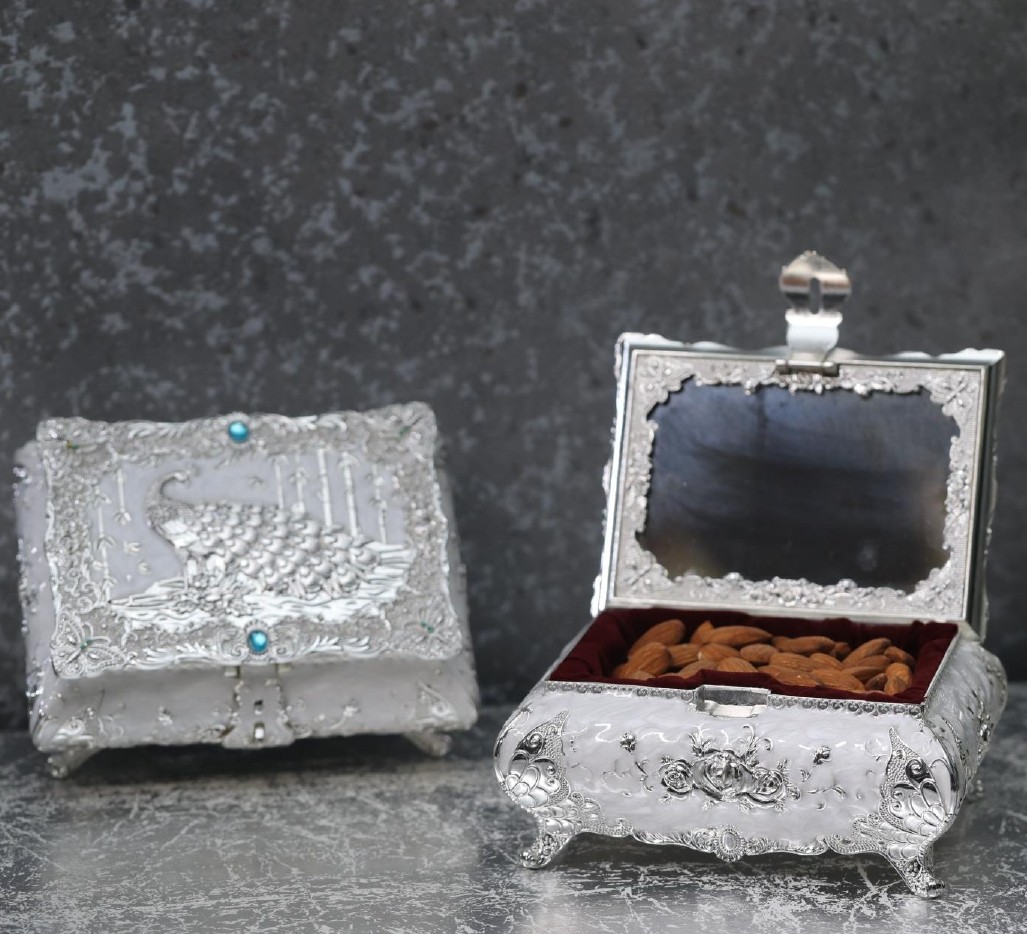 A beautifully crafted silver dry fruit box designed to store and serve dry fruits in a luxurious way. Featuring elegant detailing and a polished finish, this box adds a touch of sophistication to your table or gifting collection. Ideal for keeping dry fruits fresh while enhancing presentation during special occasions.
