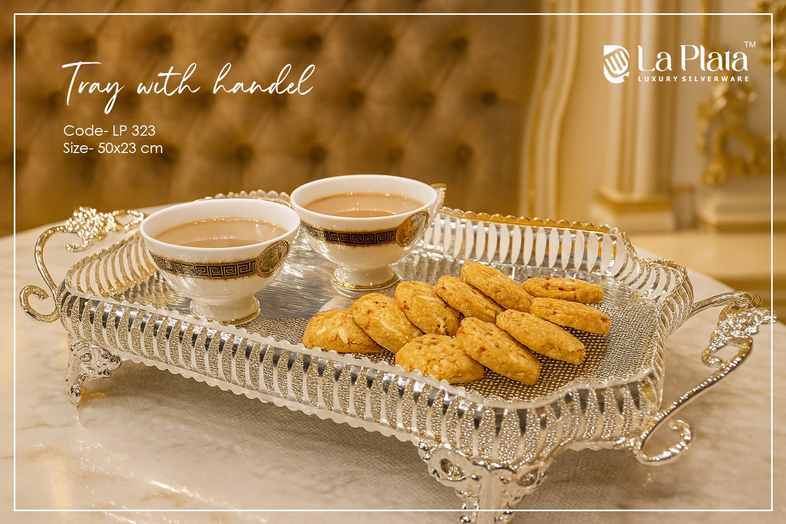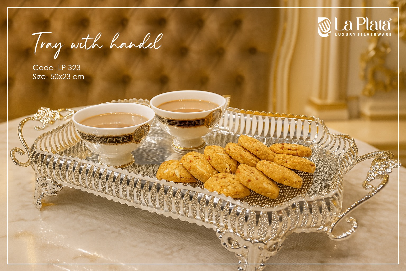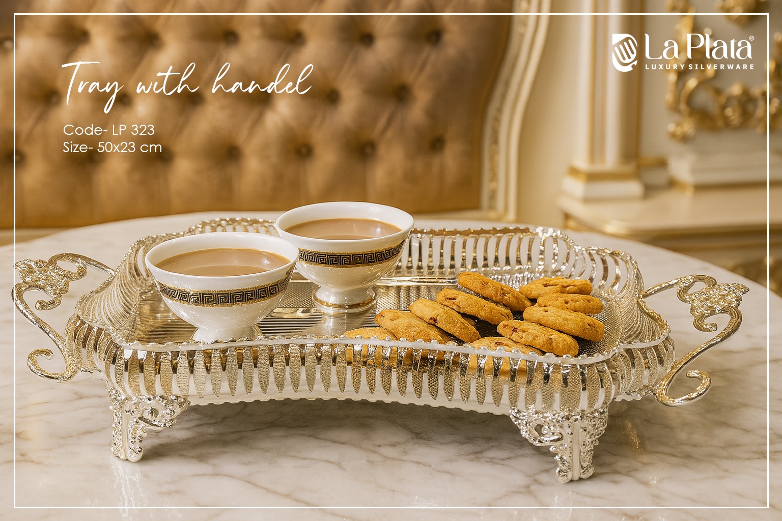 This elegant tray showcases a royal vintage design with intricate detailing and decorative handles on both sides. The beautifully crafted raised edges and ornamental feet give it a luxurious and classic appeal, making it perfect for sophisticated serving. Its polished silver finish combined with delicate patterns reflects timeless craftsmanship, adding a touch of grandeur to tea-time presentations, special gatherings, and festive occasions. The tray blends traditional artistry with modern elegance, making it both functional and visually striking.